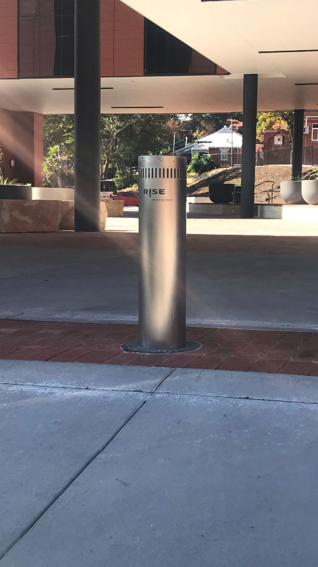 Each bollard is equipped with pre-alarm LED lighting and an audible warning system, alerting pedestrians and drivers before activation — a crucial feature in environments where students, staff, and vehicles coexist.